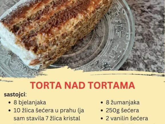 TORTA NAD TORTAMA Sastojci: Za kore: 8 bjelanjaka 10 kašika šećera u prahu (ili 7 kašika kristal šećera) 8 kašika mljevenih oraha 2 kašike brašna 1/2 kašičice praška… Read more »