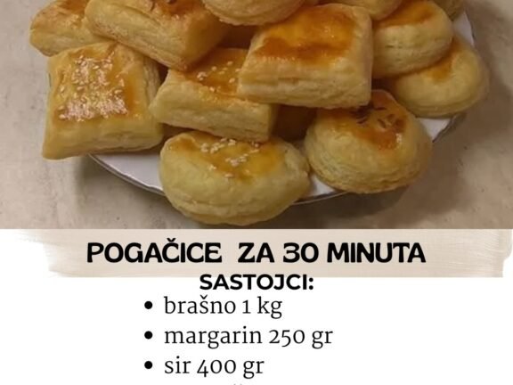 Sastojci: brašno 1 kg margarin 250 gr sir 400 gr so 1 kašikica jaje 1 komad kvasac 1 komad voda 100 ml Priprema: Staviti kvasac da nadođe u 100 ml… Read more »
