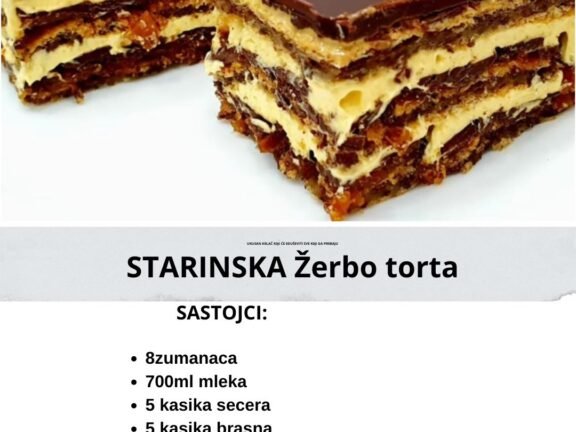 STARINSKA Žerbo torta. Recept za tortu koja mami osmehe Sastojci: Za biskvit: 9 belanaca 11 kašika šećera 15 kašika mlevenih oraha 2 kašike brašna 1 vanilin šećer Ispeći 1 koru… Read more »