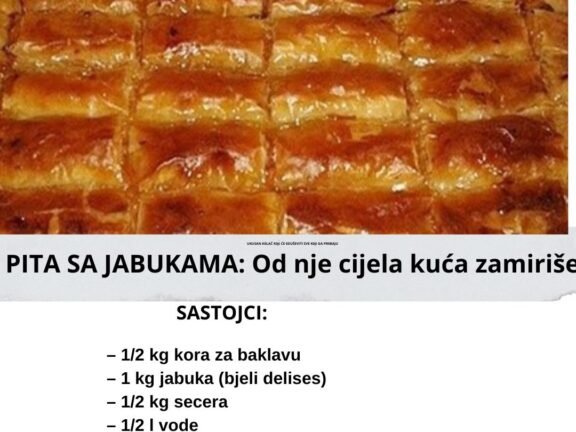 Predivna pita sa jabukama. Od nje cijela kuća zamiriše. Sastojci: – 1/2 kg kora za baklavu – 1 kg jabuka (bjeli delises) – 1/2 kg secera – 1/2 l vode… Read more »