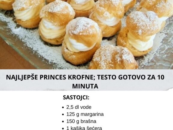 Princes krofne Sastojci: Za tijesto: 2,5 dl vode 125 g margarina 150 g brašna 1 kašika šećera prstohvat soli 4 jaja Za kremu: 1/2 l mlijeka 250 g šećera 2… Read more »