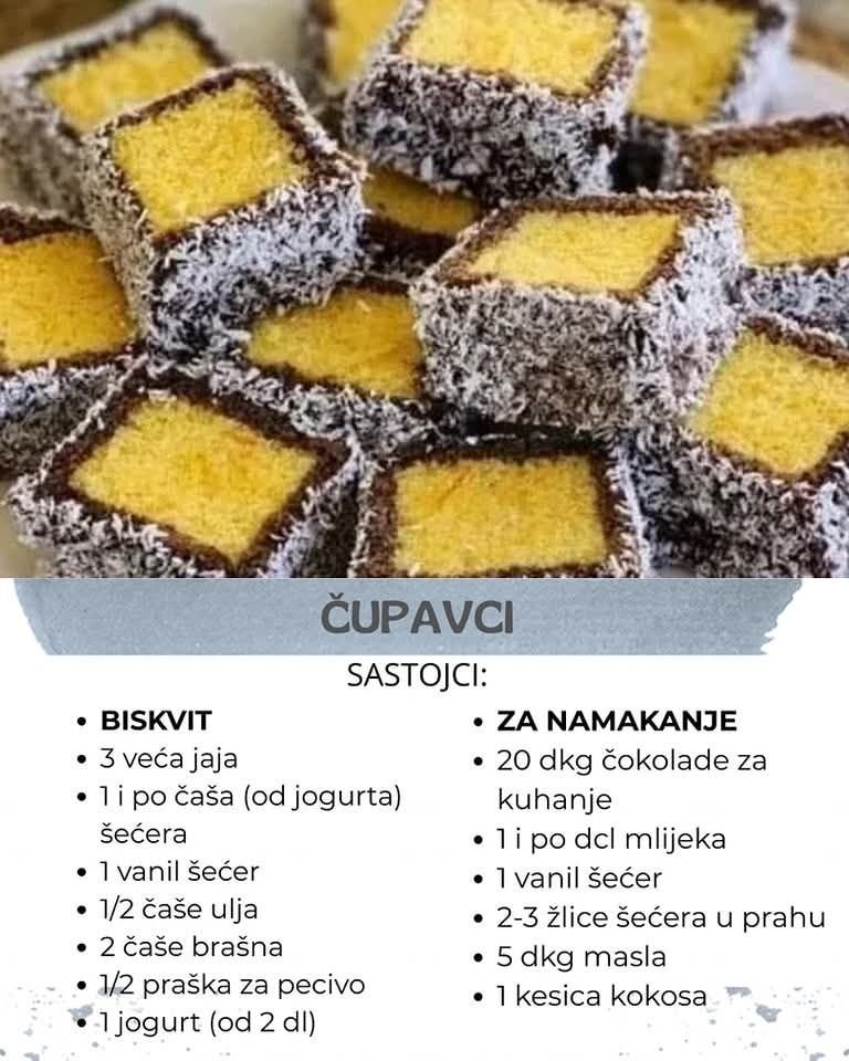Smjesu izliti u namašćen i pobrašnjen kalup i peći dok biskvit ne porumeni na 18o °C. Čokoladu otopiti na pari, dodati vanil šećer, šećer u prahu, maslo i mlijeko. To sve dobro mješati na pari dok se ne pretvori u jednoličnu masu. Gotovi, ohlađeni biskvit izrezati na kocke. Svaku umočiti u smjesu od čokolade, pa u kokos, ostaviti da se dobro ohladi.Meni su čupavci najbolji sutradan, kad se biskvit namoči od čokolade. Tada su mi najsočniji. Stavim ih u plastičnu zdjelu (veću) s poklopcem.