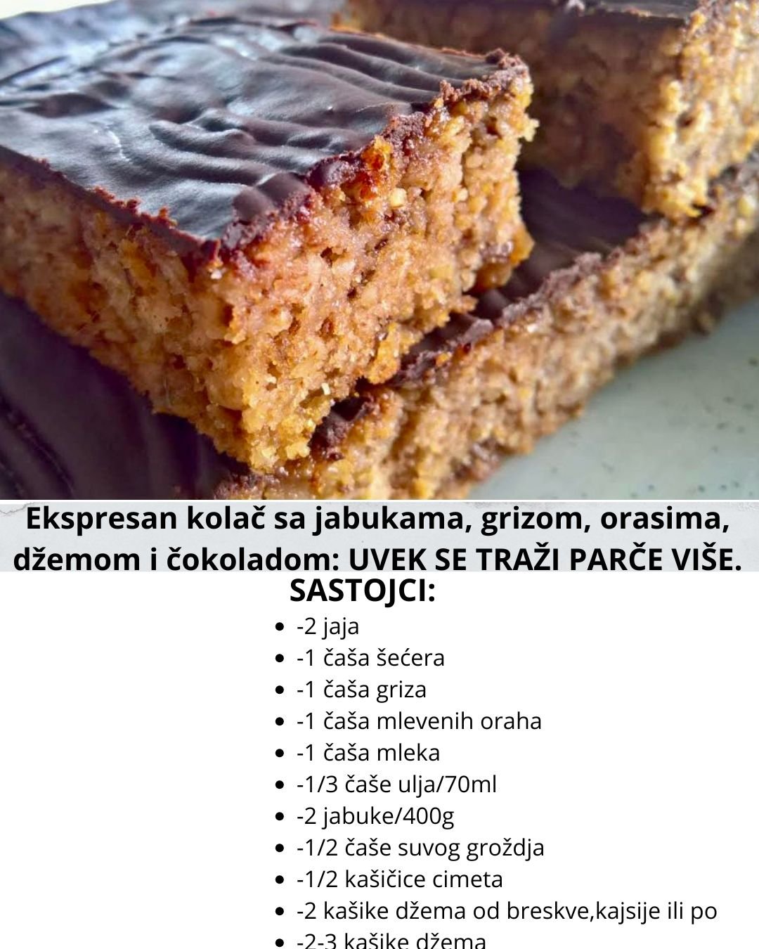 Kolač sa jabukama,grizom,orasima,džemom i čokoladom.Neverovatno ukusan.
