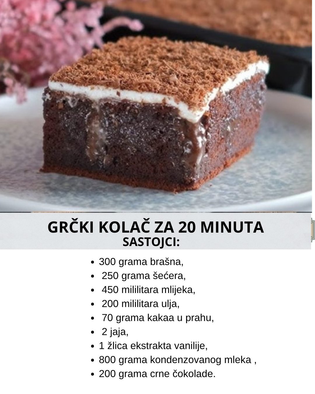 Sastojci: 300 grama brašna, 250 grama šećera, 450 mililitara mlijeka, 200 mililitara ulja, 70 grama kakaa u prahu, 2 jaja, 1 žlica ekstrakta vanilije i prstohvat soli. Za fil: 800 grama zaslađenog kondenzovanog mleka i 200 grama crne čokolade.