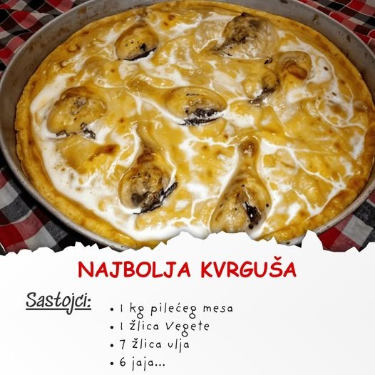 Na toplo ulje izlijte trećinu pripremljene smjese od jaja i brašna. Na to rasporedite popečeno meso, a po mesu izlijte preostalu smjesu od jaja, brašna i mlijeka. Pecite u pećnici zagrijanoj na 210°C, 20-30 minuta. pečenu kvrgušu malo ohladite, narežite, poslužite uz salatu.