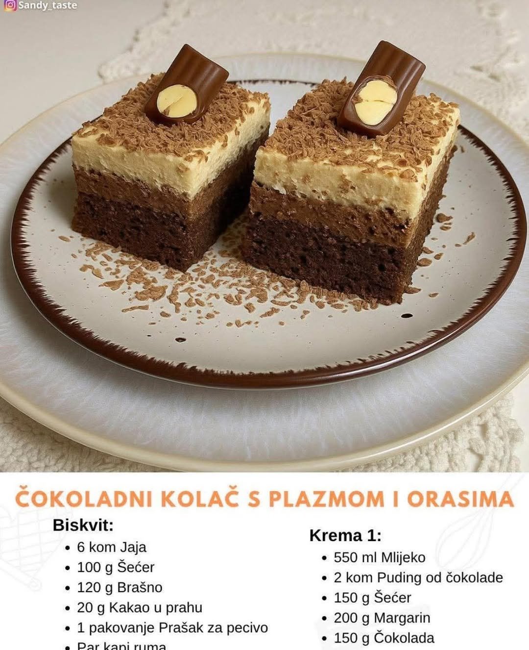 Ako tražite savršen kolač koji će oduševiti sve goste, ovo je recept koji morate isprobati! Sočan biskvit, dvije bogate kreme i neodoljiv dodatak Plazme i oraha – prava čokoladna fantazija! ✨