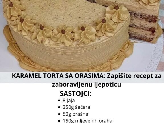 KARAMEL TORTA SA ORASIMA. Zapišite recept za zaboravljenu ljepoticu. Sastojci: KORE 8 jaja 250g šećera 80g brašna 50g prezle (krušnih mrvica) 150g mljevenih oraha Pola praška za pecivo (6g) Pečeni… Read more »