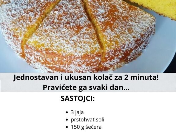 Оvo se pravi brzinom munje: PITA BEZ KORA za 5 minuta. Umuti i ispeci… Kao mjera koristi se čaša od 200ml. Sastojci: 2 jaja Kašičica soli Pola case mlijeka Čaša… Read more »