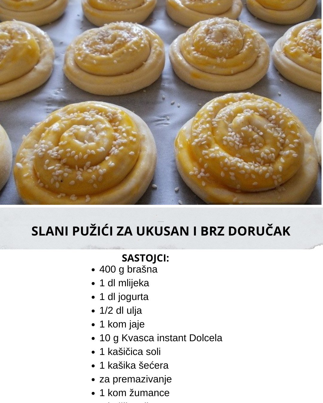 Nadošlo tijesto premijesiti pa ga istanjiti u kvadrat 35 x 35 cm. isjeći na trakice široke do 1,5 cm. i saviti pužića, kraj trakice saviti ispod tijesta.