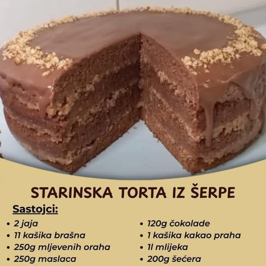 Za glazuru otopite čokoladu i vrhnje na laganoj vatri. Ovim premažite tortu i ukrasite seckanim orasima.