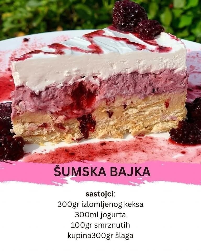 Torta Šumska Bajka je savršen ljetni desert, koji će vas osvojiti svojom jednostavnošću i svježinom. Mnogi ga spremaju i u raznim godišnjim dobima jer je veoma jednostavan i osvježavajući. S četiri osnovna sastojka – izlomljenim keksom, jogurtom, smrznutim kupinama i šlagom – možete pripremiti tortu koja će oduševiti vaše nepce. Ova torta je idealna za vruće ljetne dane, jer ne zahtijeva pečenje i brzo se priprema.