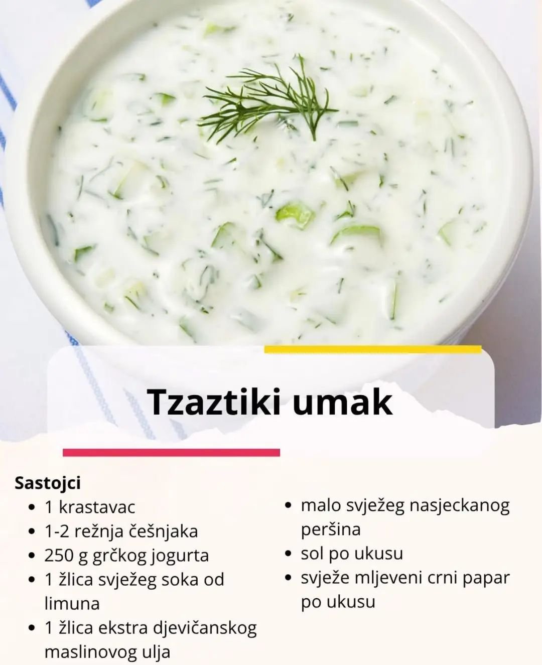 Tzatziki je tradicionalni grčki umak koji je postao popularan diljem svijeta zbog svježeg okusa i jednostavne pripreme. Obično se poslužuje kao prilog uz razna grčka jela, kao što su gyros, mousakka, suvlaki ili falafel, ali može biti i izvrstan dodatak sendvičima ili jelima s roštilja, na primjer.