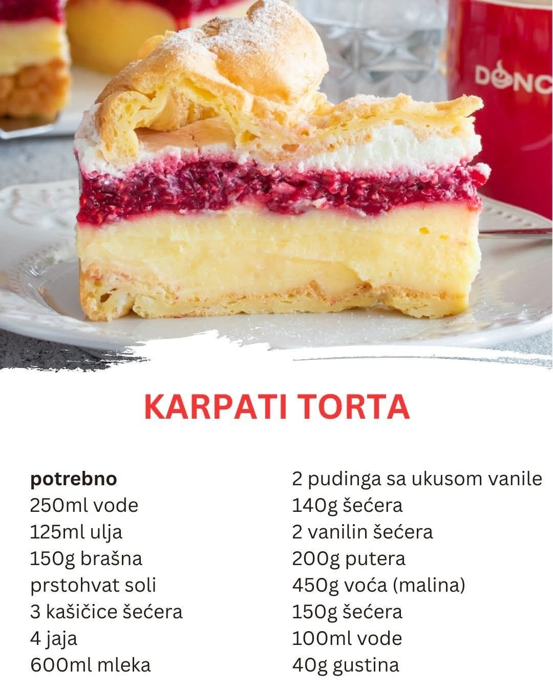 Za pripremu torte, koristićemo sledeće sastojke koji se dele na četiri glavne komponente: kora, kremasti fil, voćni fil i šlag.