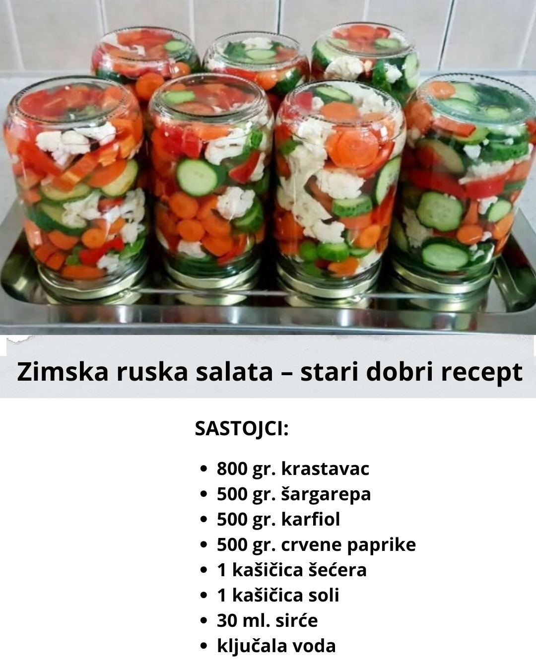 Zimska ruska salata. Stari dobri recept za najbolju salatu! Sastojci: 800 gr. krastavac 500 gr. šargarepa 500 gr. karfiol 500 gr. crvene paprike 1 kašičica šećera 1 kašičica soli 30 ml. sirće ključala voda Izvor: Moi Domasni Recepti